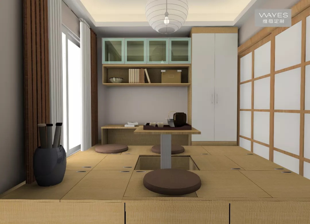 榻榻米之下的空間可以作為儲物空間。設計時要注意面板的承重能力,結實耐用的實木面板作為面是很好的。如果家里有安裝地暖,那么榻榻米之下的空間就不宜作為儲物空間了,對儲物空間的物品加熱,也許會損壞物品。