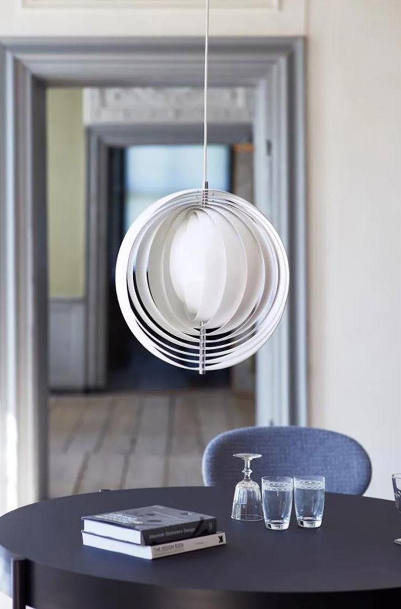 吊燈是Verpan Moon,金屬材質的弧形板條像扇子一樣排列組合,這盞燈曾在《神探夏洛克》里出現(xiàn)過。