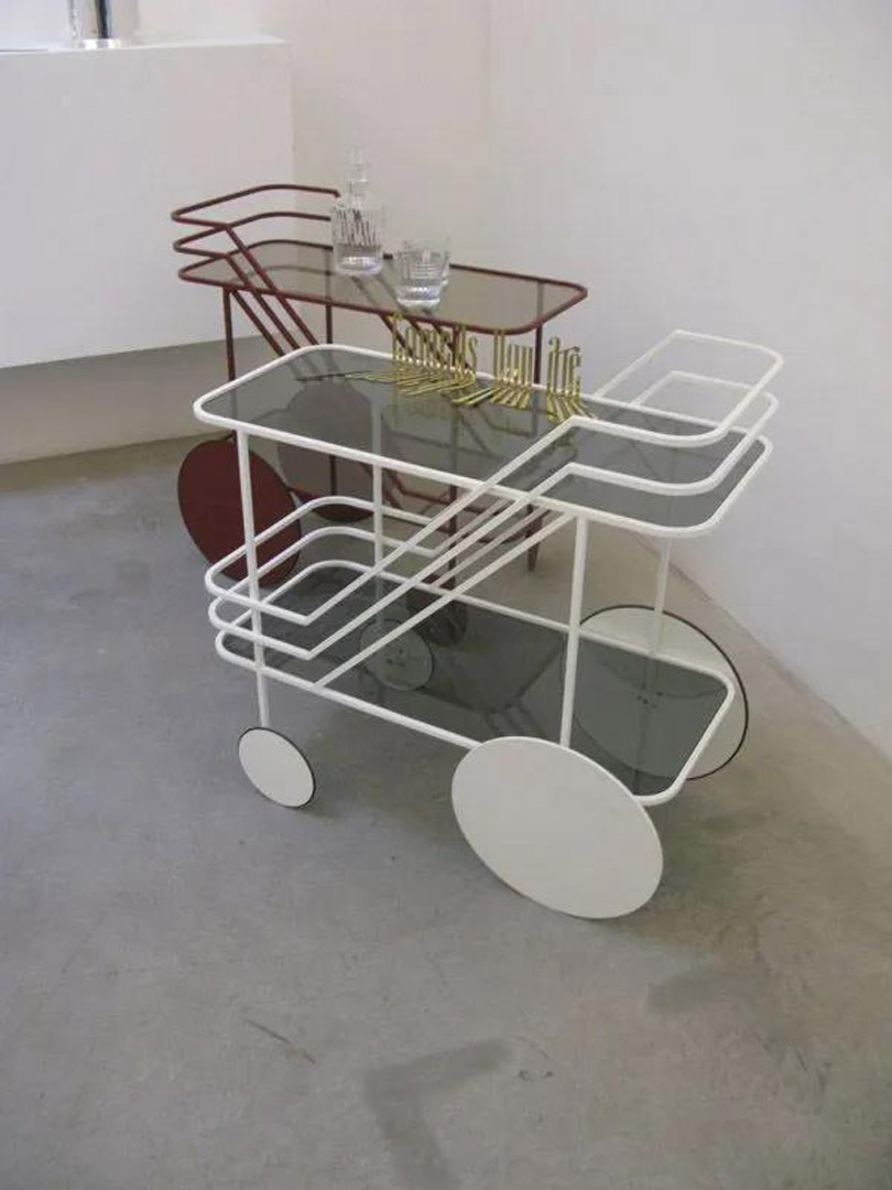 島臺和餐桌之間的過道很寬,除了吧臺凳,還擺了一個紅色酒車,這款酒車來自小眾家居品牌DANTE-Goods And Bads,是盧森堡設計師Christophe de la Fontaine的作品。