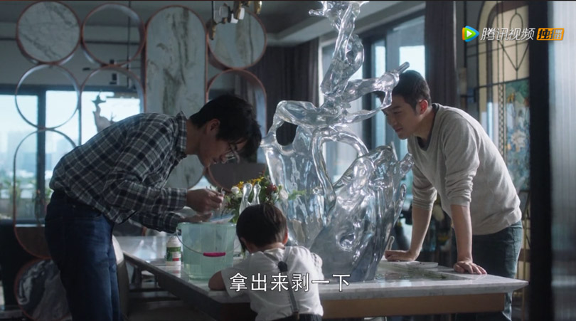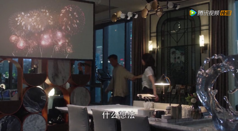 餐廳最夸張的設計是超長的大理石餐桌,一半用作就餐,一半做了一個淺水槽,槽內布了一個超大的琉璃雕塑風水局,因為水利萬物,顧家是做煙花生意的,喬遷的時候不能過火盆,這個風水局能讓生意風生水起。