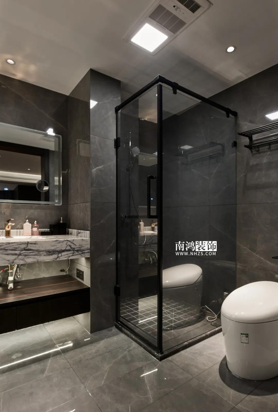 【項目·信息】 地址 / 華瑞晴廬 戶型 / 三室兩廳 面積 / 200㎡ 風格 / 現代極簡 設計施工 / 浙江南鴻裝飾 01. 客戶需求 本案的男業主是位個體戶老板,事業有成,性格熱情開朗,十分好客,由于夫妻二人目前沒有小孩,父母也是偶爾來住,對房間的需求并不大,因此戶型從原來的5房3衛改為了3房2衛,并盡可能擴大客餐廚的面積,來滿足業主的會客需求。 02. 裝飾亮點 “人內在的細膩與深切的情感,需要與之對等的空間來承載。灰與黑,看似簡單平靜,卻蘊含著無窮的魅力。” 屋主偏愛深色系,因此設計師精細地調配深色在空間中的比例,運用護墻板、大理石、皮革等質感材質,借助燈光效果,為他們打造了這個頗具神秘感和高級感的暗色空間。 03. 戶型分析 & Design Drawing 1、進門靠墻增加一組鞋柜以提升玄關收納。 2、原戶型中的兩個房間合并成餐廳區域,并與客廳打通,使人一進屋便能感受到公空間的開敞氣勢。 3、原有的一個衛生間改造成衣帽間,將主臥打造成一個包含休閑區區、寬敞主衛、衣帽間在內的豪華套間。 04. 設計落地 很多人酷愛深色 與其說天性愛低調 不如說是深色所散發出的靜謐氣質 恰好與渴求安寧的內心產生了共鳴 灰與黑打造的客廳 洋溢著高級感與神秘氣質 豐富的紋理、材質變化 在空間內形成一種微妙的和諧 熱情張揚的紅 與深沉神秘的黑 兩相對立的色彩語言 帶來十足的視覺沖擊力 & Dining Hall 黑色的皮革餐椅 搭配高顏值的大理石餐桌 打造精致的多人用餐環境 餐廳做整面酒柜 置入暖黃燈帶 既是酒水的完美收納 又是一處身份品味的象征 玄關往客廳的過渡區域 安置精心打造的吧臺 成為過道口的一處個性風景 也是日常的簡餐區 廚房擁有標準的U形操作臺 儲物充足,動線流暢 深色櫥柜與臺面 完美塑造一體式空間感 主臥承襲整體的暗色風格 深沉的灰黑色打底 傳達平和寧靜的空間情緒 豪華的主臥套房 包含休閑區、主衛與衣帽間 擯棄了所有多余的裝飾 只保留每一件必需的家具 獨立衣帽間設計 黑色柜體內藏有燈帶 酷雅有型 純粹的黑構建理性的質感 透過白色紗簾進入室內的日光 讓客臥空間 簡潔中帶上了變化 次臥床尾 安排書桌椅與書架 灰色的墻布 排除一切冗余 力求沉穩大氣 經過戶型調整 主衛內部更顯寬敞 浴缸與淋浴區分居兩側 功能區的豐滿 是給生活最大的舒適 次衛風格與主衛相似 石紋瓷磚搭配木質臺盆柜 淋浴區內設置壁龕 視覺舒適,實用性強