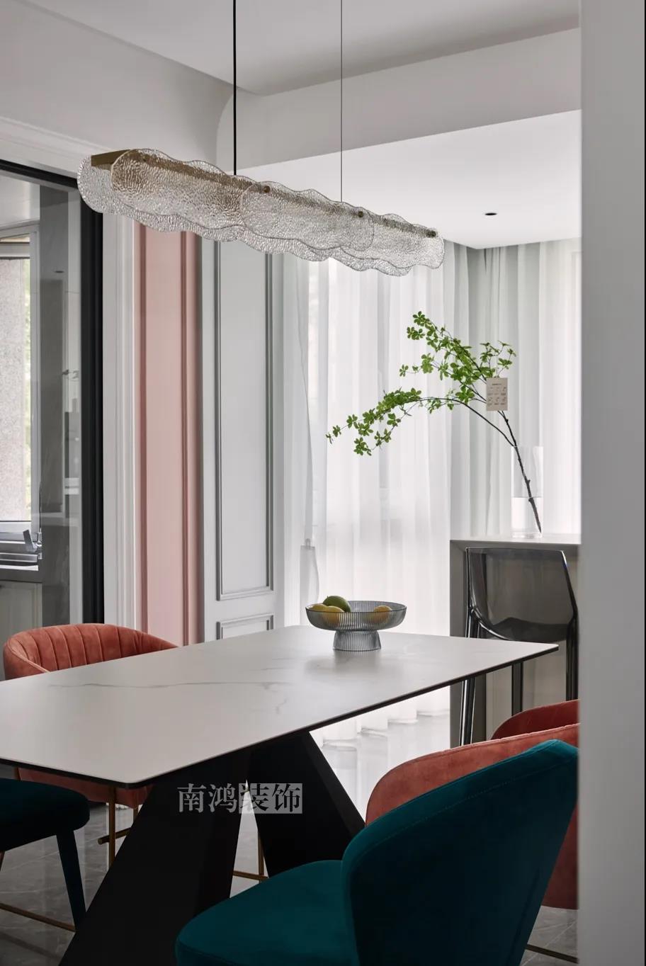 餐廳,是讓人走近便頓覺眼前一亮的空間所在。花朵般嬌嫩的煙粉色,是莫蘭迪色系中超有存在感的一派,又如晚霞,純凈美好,撲面而來便是夢幻與浪漫的氣息。