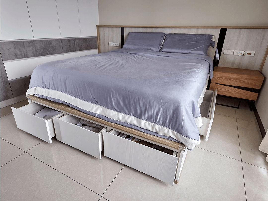 另外,床頭背景墻、床底空間等都可以利用起來。