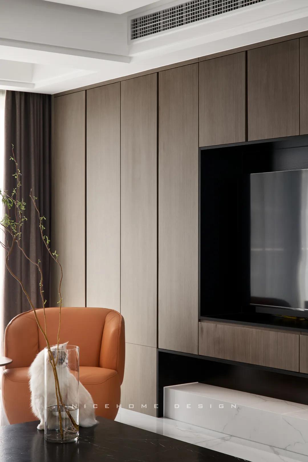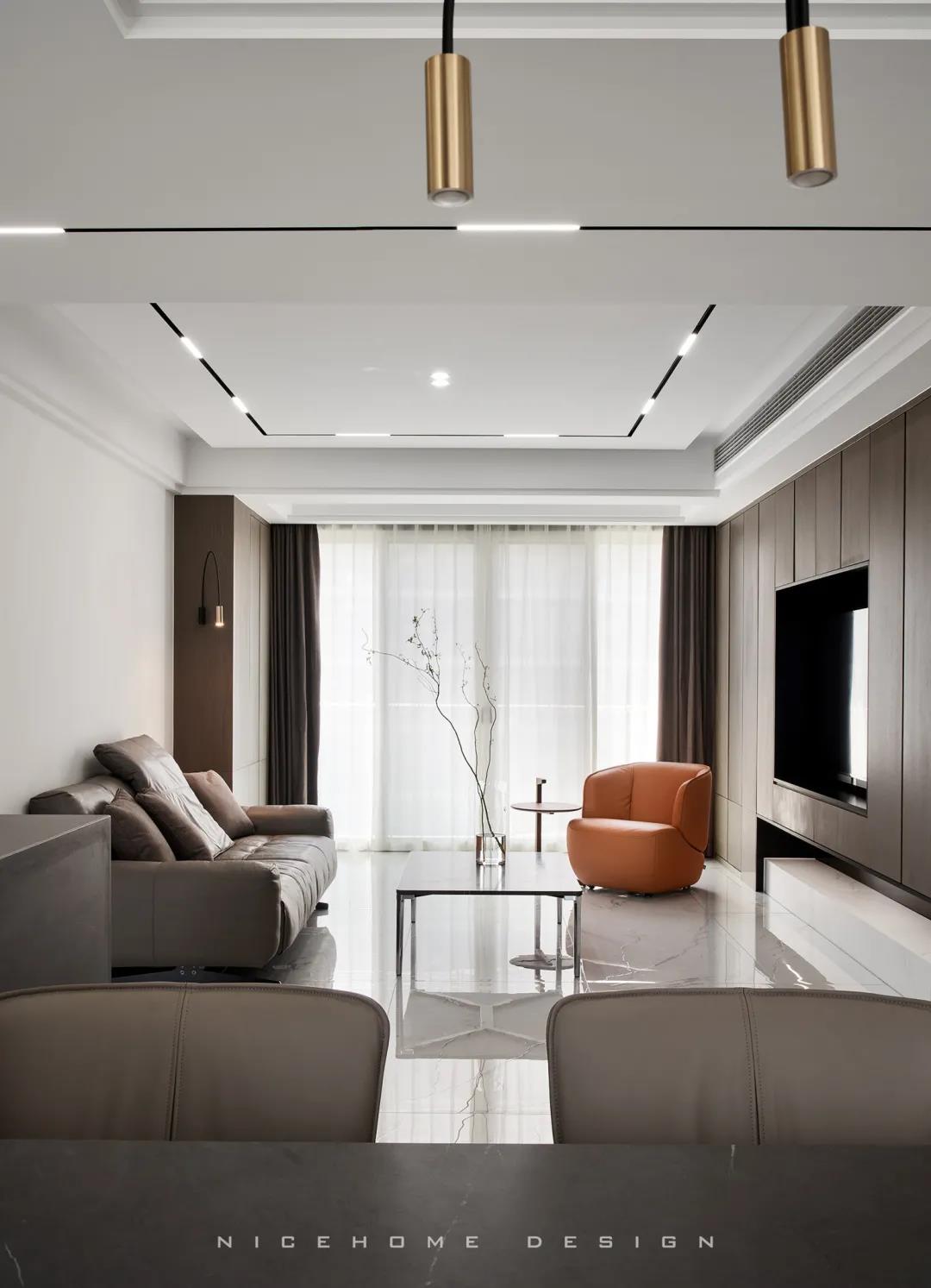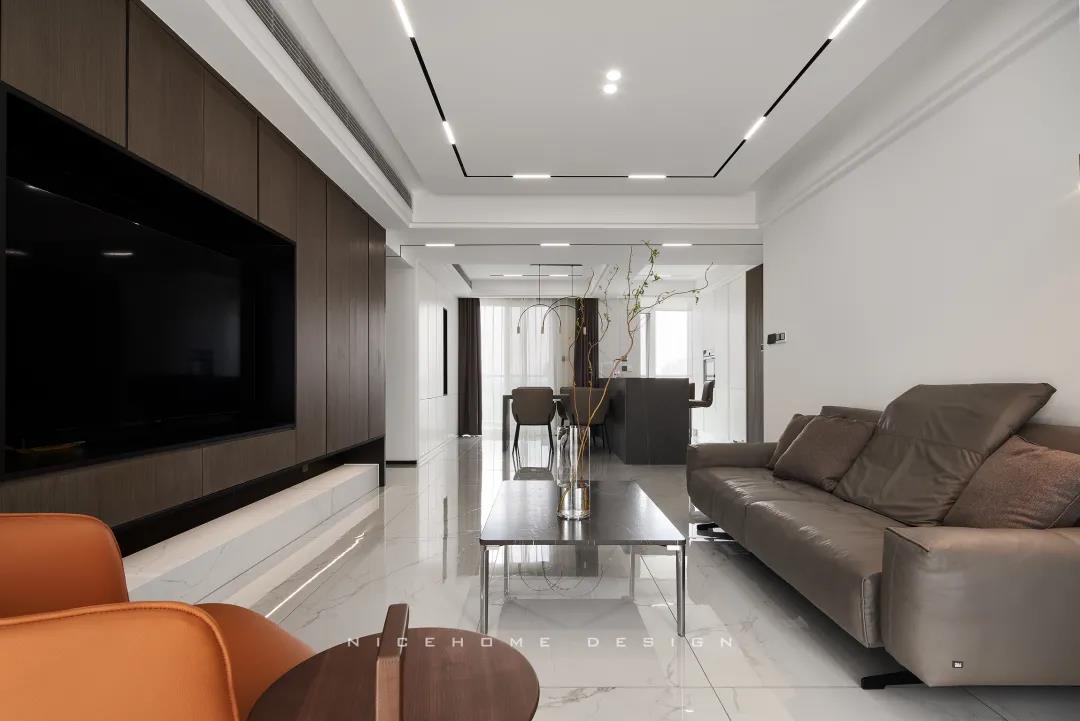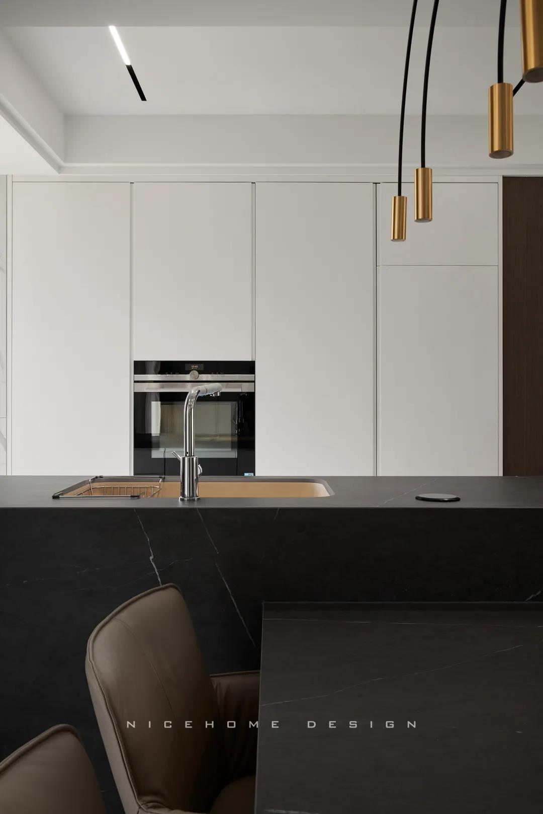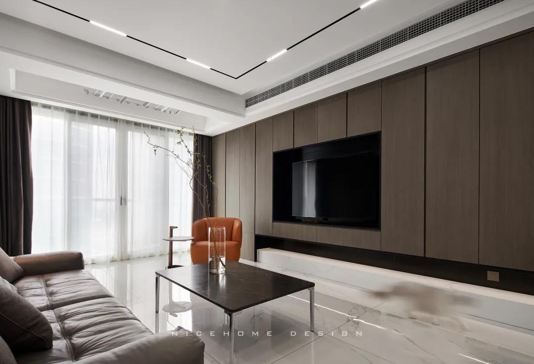Quiet Time 本案以現(xiàn)代簡約風格為主旨,潔凈的配色、高級感的家具材質(zhì),以及巧妙的空間序列規(guī)劃,再加上通透寬敞的開放式布局,令整體空間在理性的架構(gòu)中傳達著現(xiàn)代主義的美學觀感。 ? 案例信息 地址:天鴻君邑 戶型:兩室兩廳 面積:145㎡ 風格:現(xiàn)代簡約 設計施工:浙江南鴻裝飾 ? 戶型分析 屋子是超高層建筑,一方面承重結(jié)構(gòu)比較多,能動的墻體有限,另一方面采光通風非常好。 主要是把原來的入戶花園改為了廚房,這樣原來的廚房就可以作為西廚和餐廳的一部分,解決了功能上的需求也讓餐廚區(qū)更寬敞。 走廊型玄關(guān),與內(nèi)里的過道無縫銜接,加上燈線的拉伸,視覺延展性極強。左手墻面留白,右手邊做深木色的收納柜提供合適的收納空間。 空間遵循現(xiàn)代簡約的架構(gòu)模式,主色調(diào)由明凈的白和溫潤的木組成,淡然含蓄,幾根萌發(fā)綠意的小枝椏點綴出自然空靈的氣息。 電視背景墻做整面的柜體,地臺取代電視柜的位置,與上方柜體拉開一定距離,削減了一定厚重感。茶幾臺面選擇巖板材質(zhì),四四方方的造型含規(guī)整有序之意。 局部放置一把橙色單椅,讓視覺更富有生機,搭配置物小邊幾,閑暇時光的閱讀、喝茶也有了好去處。 屋子采光極好,開放式格局進一步放大優(yōu)點,光線灑入空間,成為天然的柔光濾鏡。明朗有序的線條,搭建起主人向往的現(xiàn)代品質(zhì)生活。 餐廚空間進行重新規(guī)劃后,餐廳與西廚合為一體,兩側(cè)白色高柜充分利用空間,把收納效率提到極致,極簡銑槽柜門無把手,讓視覺保持統(tǒng)一干凈。 一體成型的黑色巖板餐桌結(jié)合西廚島臺,塑造空間純粹內(nèi)斂的高級質(zhì)感,清冷有型之中悄然散發(fā)出精致韻味。 步入主臥,過道一側(cè)將衛(wèi)生間干區(qū)與收納柜結(jié)合,類似酒店式的布局,干凈清爽。操作臺面周圍做擋水條,可以很好地防止濺水。 主臥內(nèi)部利用陽臺拓展使用空間與視覺深度,同時讓更多的自然光線進入房間。背景墻留白,絳紫色絨布床頭詮釋著優(yōu)雅,陽臺處擺放主人的健身器械方便早起運動。 衣庫位于主臥與次臥中間做統(tǒng)一收納,柜門使用長虹玻璃隔斷,結(jié)合柜內(nèi)燈光所呈現(xiàn)的若隱若現(xiàn)的朦朧感,超絕!