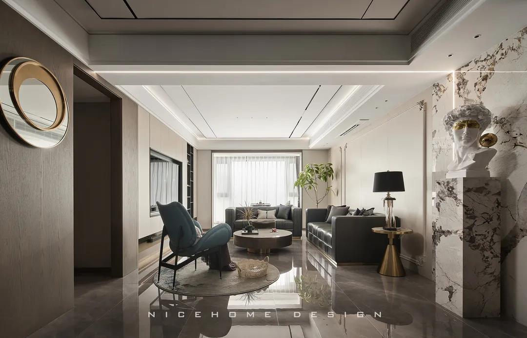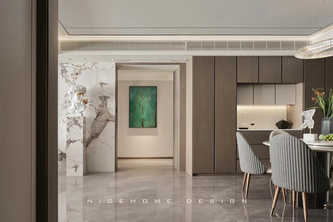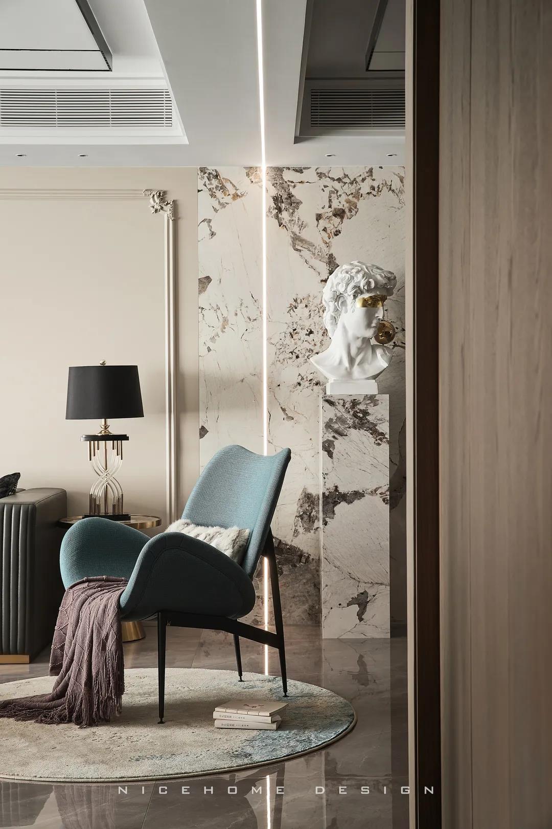 頂面黑色不銹鋼和磁吸軌道燈形成線條延伸感,增加了視覺層次。沙發(fā)背景植入小法式護(hù)墻混搭,與大衛(wèi)雕塑組合,為空間注入靈動(dòng)與格調(diào)。自過(guò)道口頂端特意拉出一道折線燈帶,勾勒個(gè)性的藝術(shù)氣場(chǎng)。