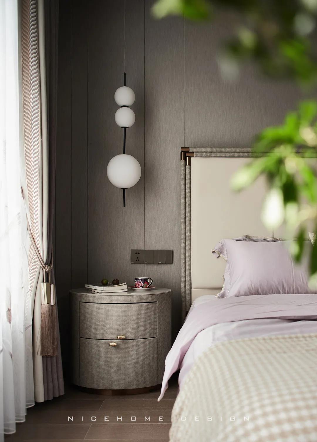 客臥的氣質(zhì)同樣雅致非凡,光線流連入內(nèi),盈盈散發(fā)著溫潤(rùn)平靜的質(zhì)感。右上角的個(gè)性掛飾就像是懸浮在半空中的月亮,讓夜晚充滿浪漫的情調(diào)。