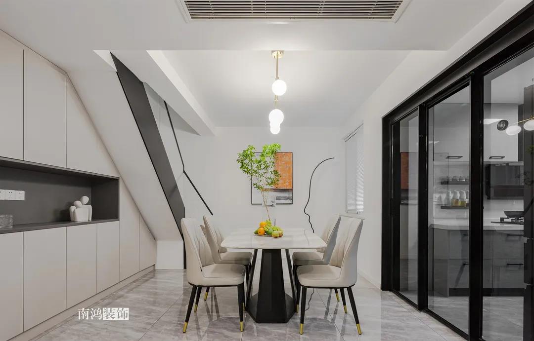 本案是一套現代輕奢風格的復式作品,業主夫妻二人,暫無小孩子,房間上除主臥之外,保留了兩個次臥做父母房和兒童房,一樓寬敞通透的開放式公區域設計成為本案一大亮點。 一層集合了日常所有的的煙火氣,蒸箱、烤箱、咖啡機、洗碗機、洗衣機...攜帶著一種隨性的自由,廚房到客廳依次構成白與黑、疏與密、放與收的過渡對比,層次感的疊加形成舒適的視覺體驗。 空間以暖調的木飾面色搭配黑白灰作為整體基調,簡約利落又不失家的溫馨。 戶型分析 ▼ 原始戶型存在一樓空間相對擁擠,樓梯陡峭,走起來費力,二樓空間利用率不高等問題。 1、樓梯位置調整,打造多個收納展示空間。 2、原有結構陽臺納入室內,擴大客廳使用面積和直接采光面。 3、廚房門洞改變方向,消除了原廚房與客餐廳的隔閡,打造一體化、全開放的格 局。 入戶區迎面而來一層開放大格局,往左為客廳,視野通透舒暢。定制儲物柜滿足基本的收納需求,色彩由淺入深,層次清晰分明,滿足功能的同時不失視覺美感。 青草綠點綴出小清新,柜內設計隱藏式燈帶,見光不見燈的效果,簡單一筆勾勒出空間輪廓與光影質感。 客 廳 LIVING ROOM 美觀大方的客廳空間,左右兩側維系著剛剛好的距離,溫和的底色在視覺上減輕了壓迫感。大理石與木飾面結合的電視背景,搭配硬包,皮藝沙發和單椅,顯出輕奢意味。 黑白灰三色搭配的餐廳空間,點綴的金屬材質點亮活力。開敞明亮的用餐環境,兩側都留有足夠大的通道距離,應對日常的社交聚餐可以說毫無壓力。 空間的時尚高級感,除了整體硬裝、家具的造型選擇之外,更重要在于細節的雕琢。由樓梯下來的白凈墻面,除了懸掛常規的裝飾畫外,由黑色線條勾勒的人像圖形也頗有趣味,讓人能感受到一種自在而愉悅的氛圍。 灰色向來是現代感家居的寵兒,沉靜色彩更能凸顯質感。 廚 房 KITCHEN 廚房與餐廳以玻璃門相隔,保持視覺的通暢,U型設計極大地提高空間利用率,洗菜、切菜、烹炒動線流暢,高效下廚輕輕松松。 主臥包入陽臺打造為休閑區,床頭背景清新的淺藍色與床品的灰色、單椅的橙色形成了具有層次感的溫馨格調。 床尾打造女主人的梳妝臺,豎線條裝飾營造縱橫維度的立體感,與留白的墻面相映襯,豐富了主臥空間的現代意象。 休閑陽臺除了一把單椅外,還有造型輕巧的穿衣鏡與掛衣架,生活的小確幸就在一點一滴的細節間把握。 長輩房藏在客廳隱形門背后,不增添過多修飾的空間更加簡約耐看,偶爾來小住的父母也有了私密的休憩之地。 長虹玻璃門引入外部光線,保證衛浴室的明凈感受。壁掛馬桶不留衛生死角,方便日常清潔。黑色的五金件隱隱占據視覺主導,將利落的現代感盡可能放大。