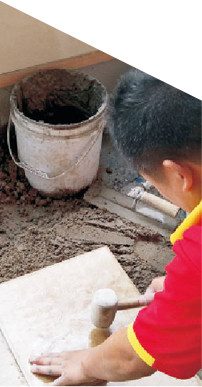 墻磚從第二片開始鋪貼,做到墻磚壓地磚